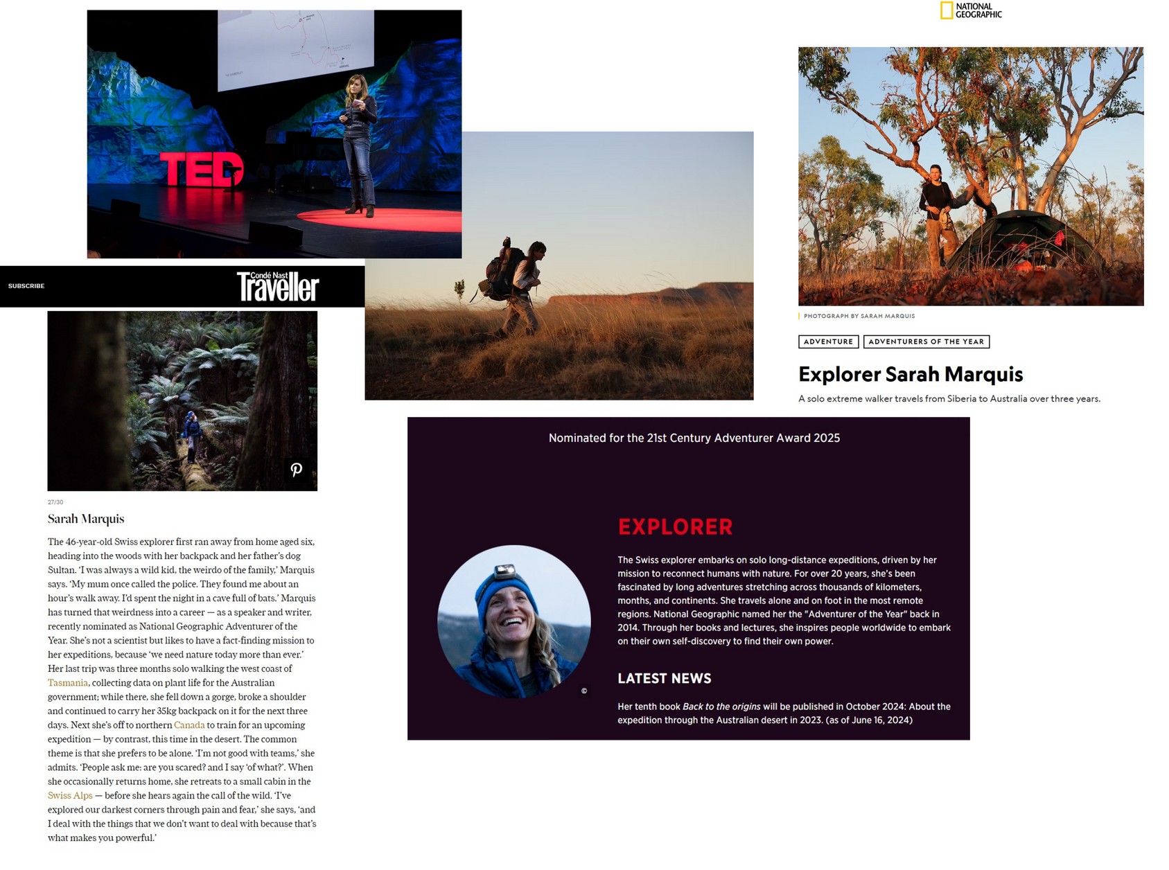 I am a Swiss explorer. I was named National Geographic's Adventurer Of The Year and am humbled to be on Conde Nast Traveller's list of World's Most Influential Women Travelers (sharing that list with the likes of Dian Fossey, Angelina Jolie, Jane Goodall and Amelia Earhart!).I guess I am a true seeker. At the age of 6, I literally ran away from home because 'I was curious' (and my mum told me 'no' but I'll save that story for when we're together)!Since then, I've walked ALONE a distance that would circumnavigate the world!These journeys, including walking from Siberia to Australia, from Santiago, Chile to Machu Pichu and crossing the salt water crocodile infested Outback of Northern Australia give me "an interesting perspective".In this experience, I invite you to examine your own struggles around fear, endurance, solitude and connecting with nature both with me and through me...